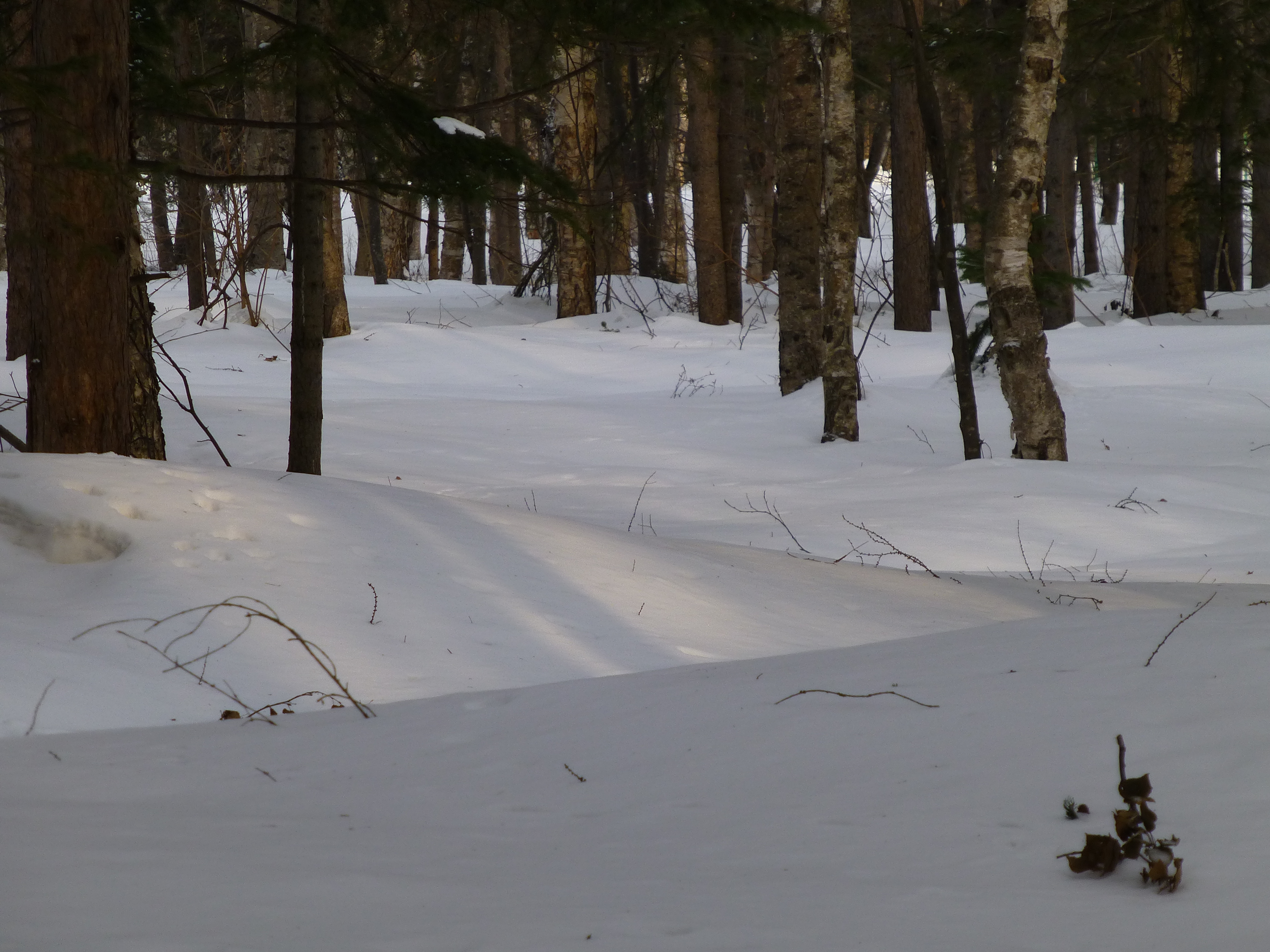 Sunlight breaking through the tree branches overhead – making a great pattern of shadows on the snow –