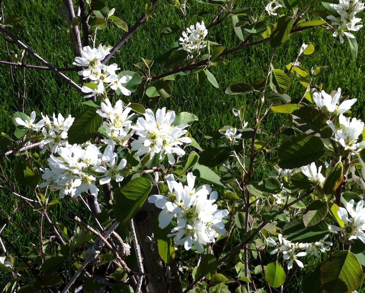 I grew up in the bottom of a shallow valley with brush along water runs and the creek that had carved the valley in the first place. Saskatoon bushes grew in some places………. and were a highly prized find. The flowers were sweet and white, and one of the first bushes to bloom. You needed to mark the spot carefully, and hope that late frosts and early birds didn’t beat you to the luscious fruit in July. I think that this shrub only grows in the Canadian Prairies……. it tastes a bit like a blueberry, but is redder, and much more delicious, especially with just a touch of lemon. Saskatoon pies and jam were always a wonderful summer treat.