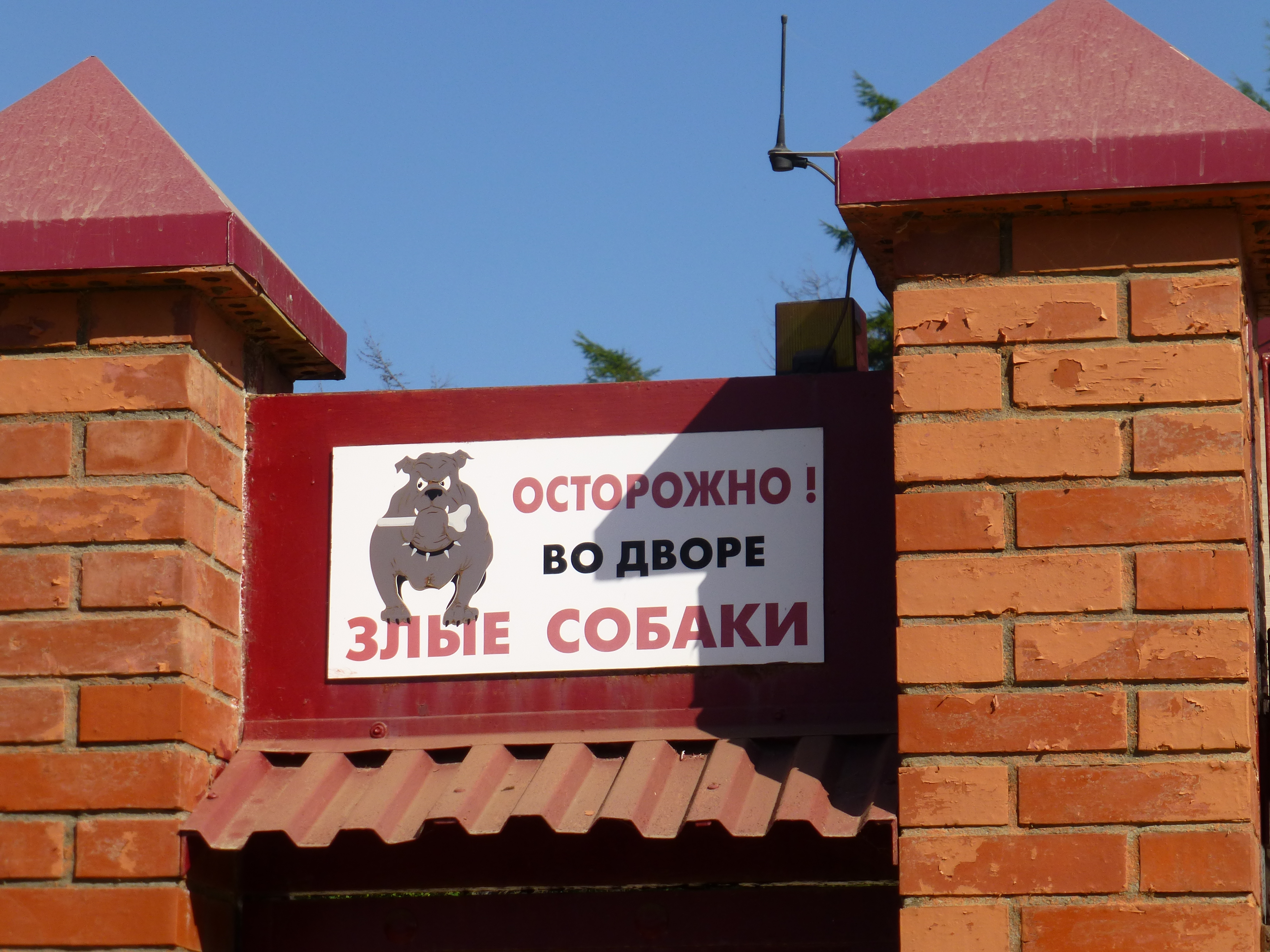 As we walk along the street, we pass some very beautiful houses, all barricaded behind tall fences. Most have guard dogs tethered inside.