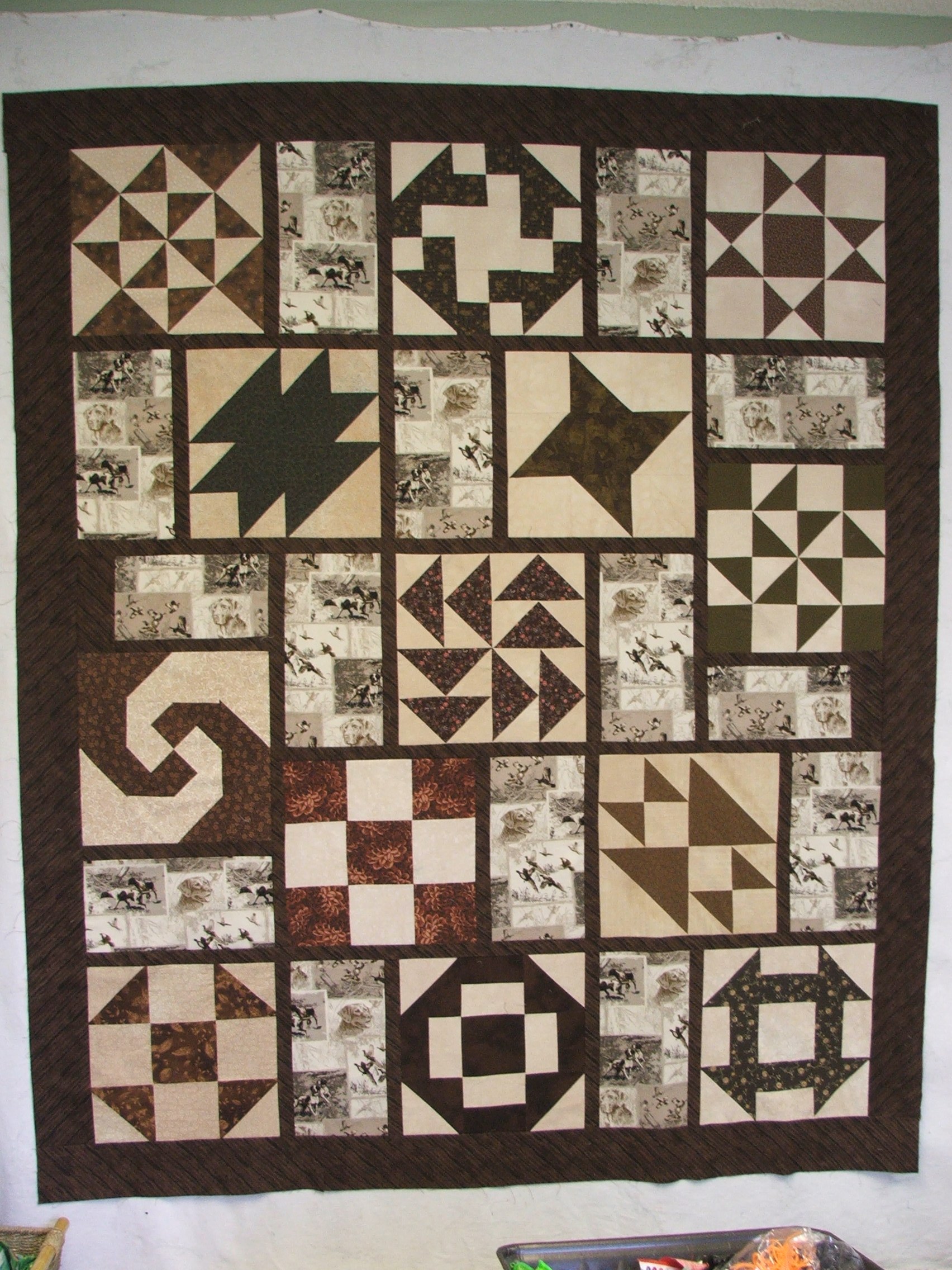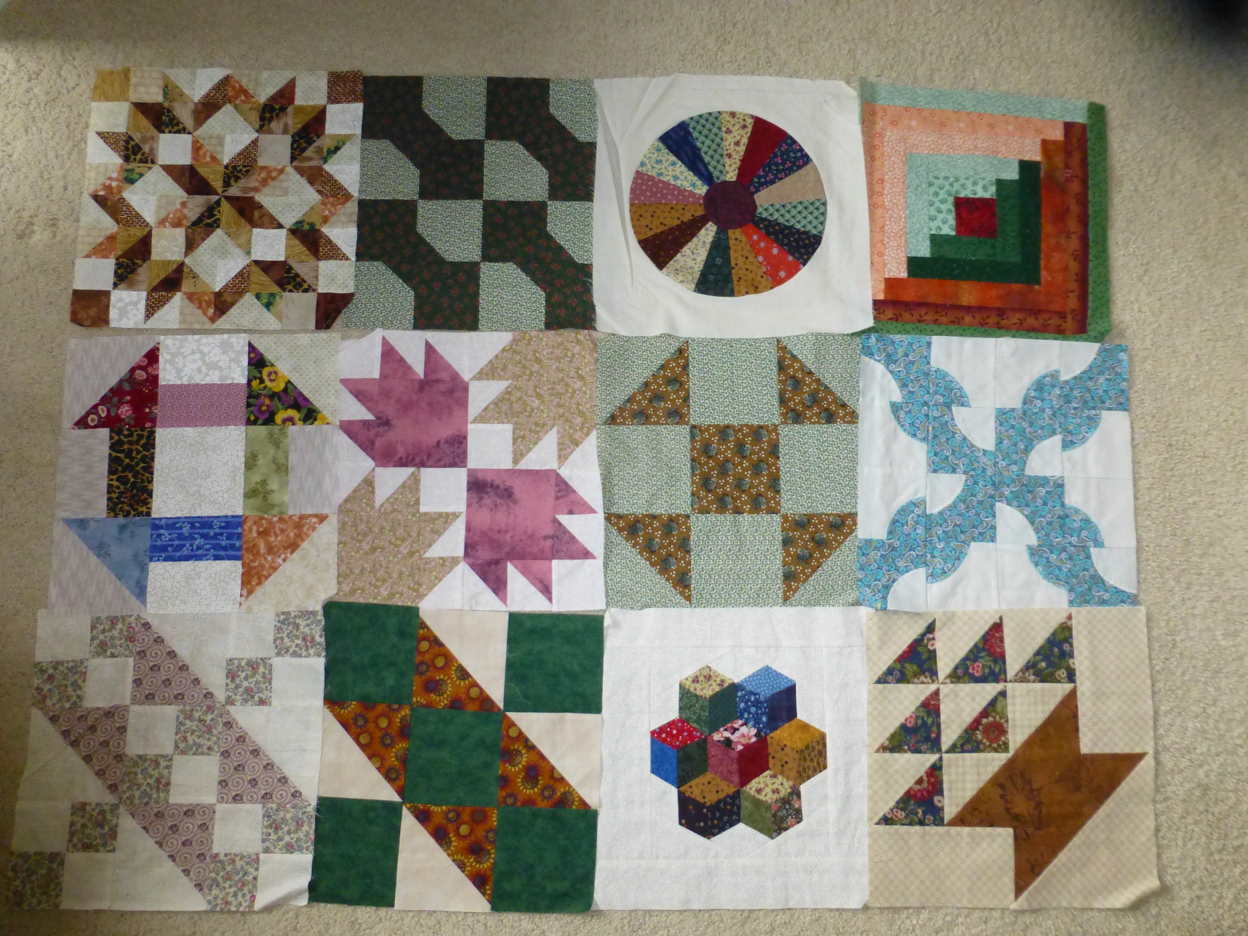 I also discovered online quilt groups early in my quilting life, and what a revelation.  Here I joined with other quilters from all over Canada – and the USA – and became a part of block lotto and swaps. I joined with eleven ladies in an Underground Railway quilt block swap, and faithfully made 12 Wagon Wheel blocks and Tumbling Blocks. Wouldn’t you know it, I had been away the weekend of the sign-up and the two most difficult were the ones left.  I sure understood Y-seams by the time I was finished.  And while the legend (or myth) of the Underground railway using quilts as messages has been debunked, I think there must have been some element of truth for it to persist for so long…. and it was a very skill-building project, especially for me. Here are 12 of the 20 blocks –P1060896
