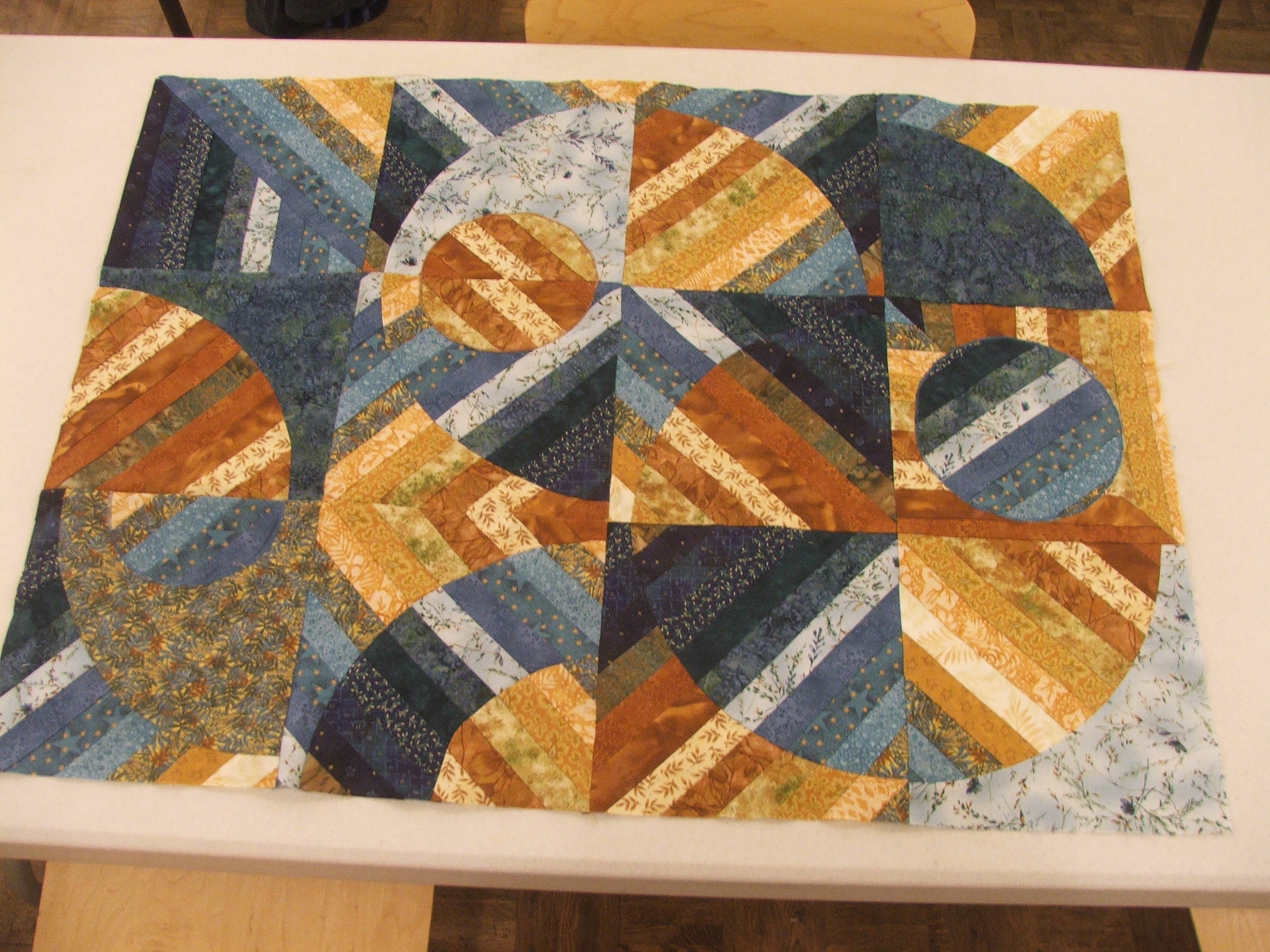 Here is another – a colour swap where I ended up with the brown and white ones.  The white seemed pretty stark, so I tea-dyed the blocks, and created this – I love asymmetry, and this was my first attempt at putting it into a quilt.DSCF1087