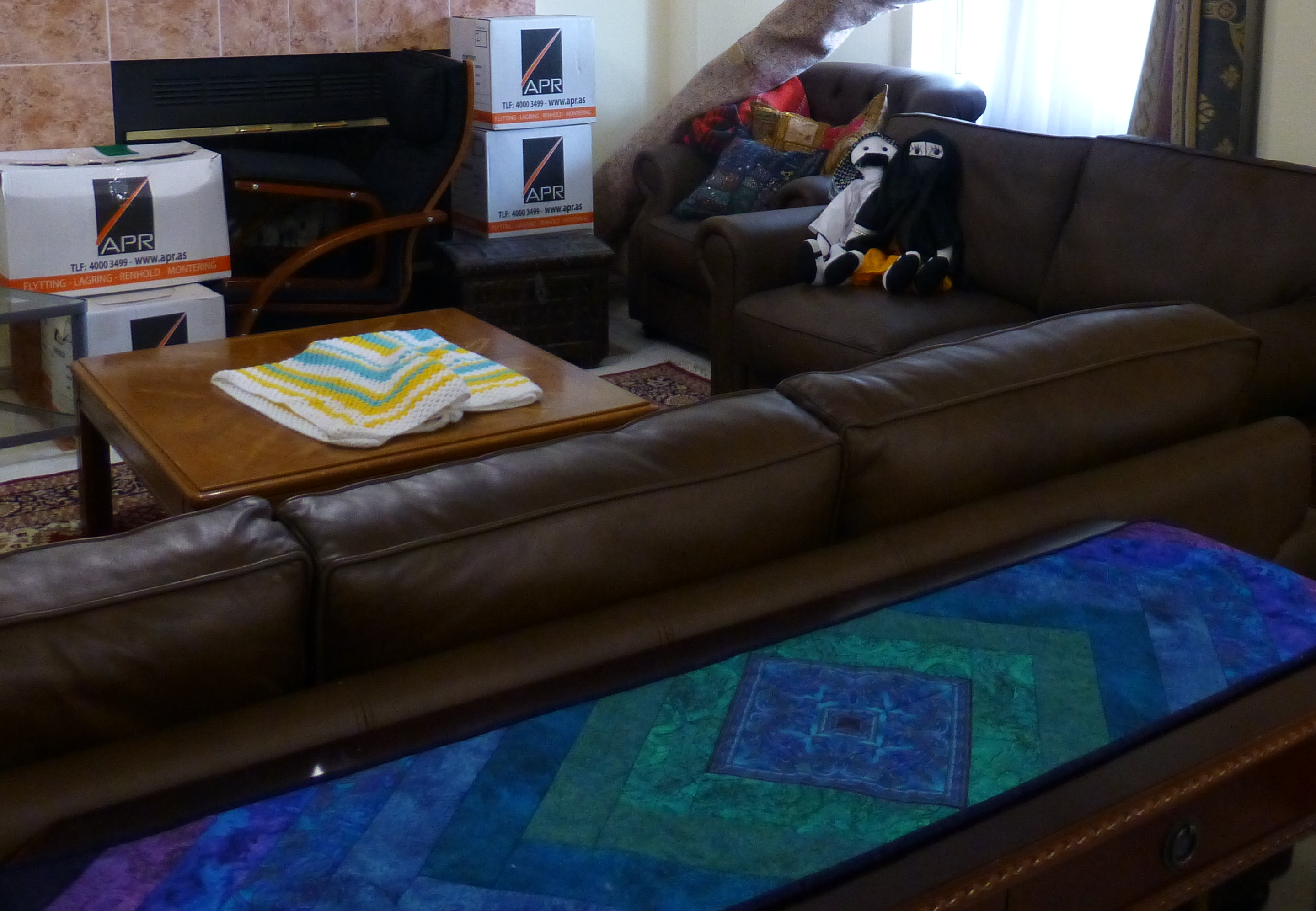 Being in the Middle East, with sketchy mail service, I didn’t participate in swaps.  When we arrived in Norway, I took advantage of the excellent postal system to again join in a Christmas gift exchange.  Look at the wonderful table runner Lori sent me from Canada – and how well it lights up my living room here in Russia.  I’m in it again this year – and am hoping that the Russian postal service doesn’t let me down. As you can see, it was out before the unpacking was completed.P1060434