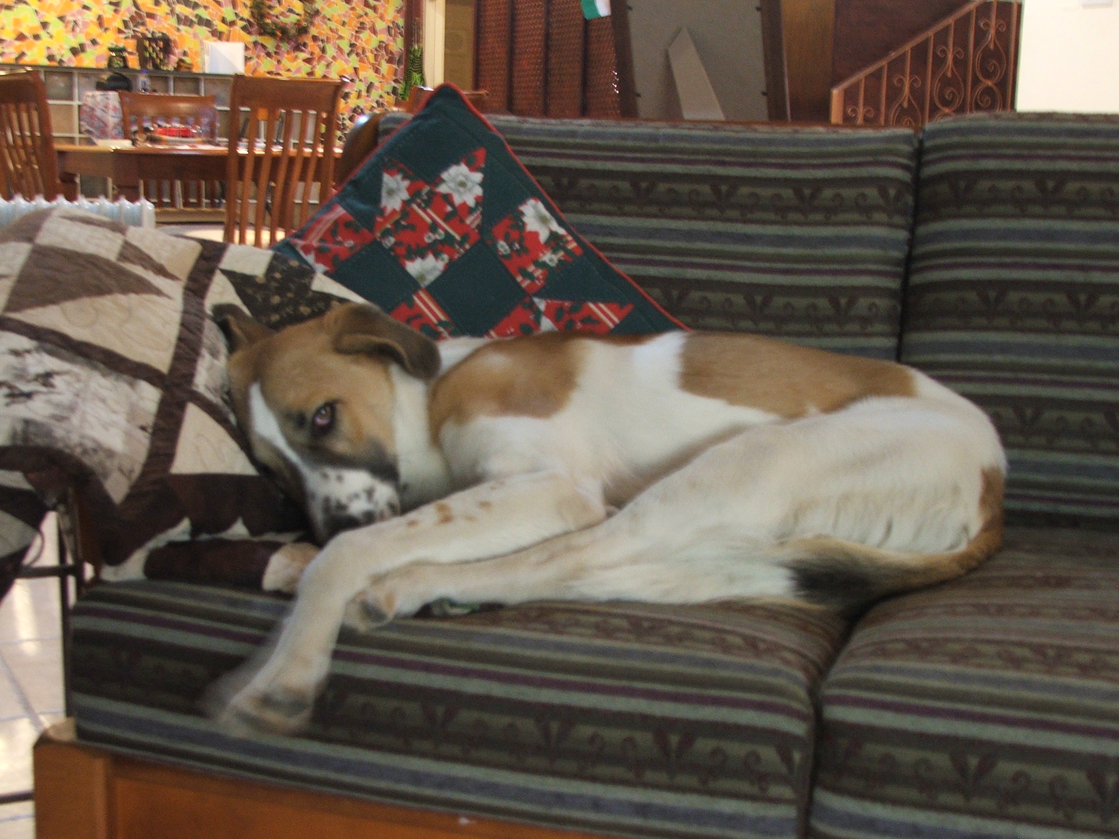 And here is my dog, enjoying the results (NOT supposed to be on the couch) and the pillow I made  – my first quilting project. There are dogs on the quilt – so I guess he thought he was entitled.Snoopy Original Photo