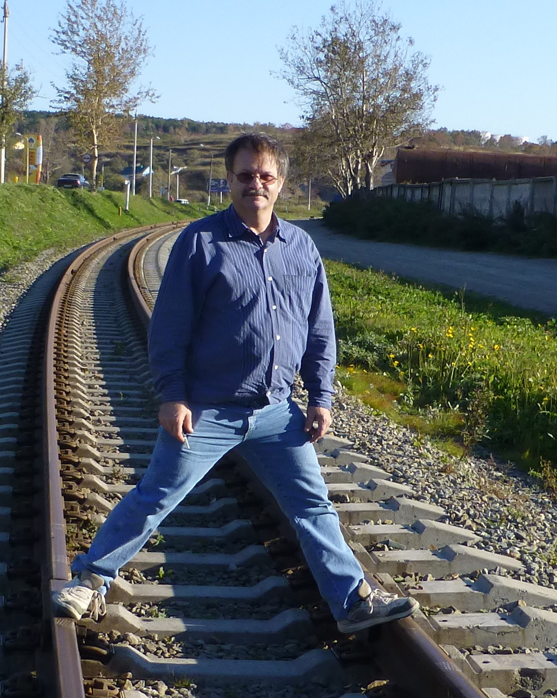 David had to have his photo taken straddling the old narrow-guage Japanese railway tracks.