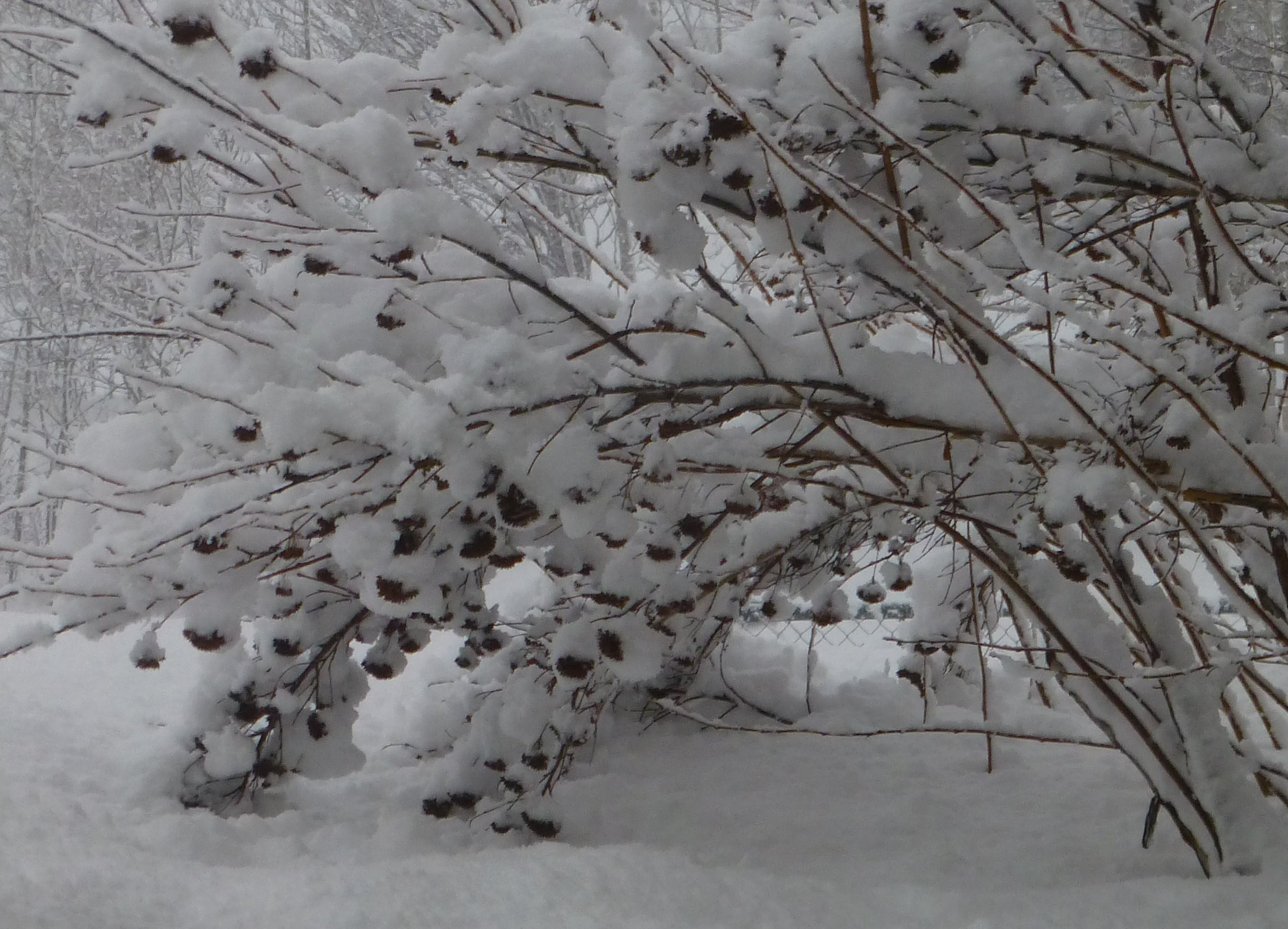 This bush is just outside my back window. It is a tall shrub – the snow level is about 3 1/2 feet (one meter) above ground level. The huge snow balls resting on the spent flower heads of wet snow pulled the branches down to the top of the drift.