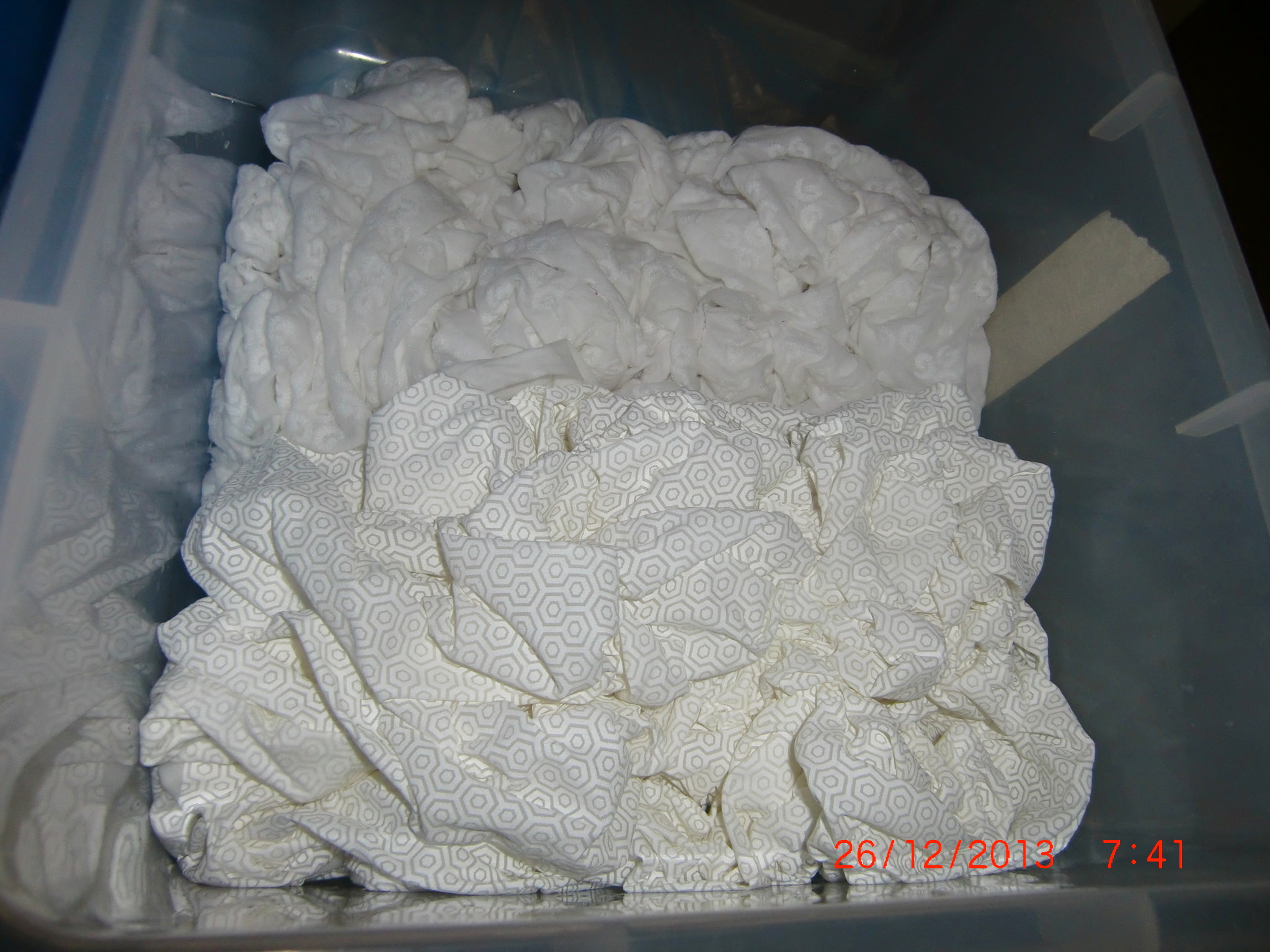 We used the instructions from http://www.instructables.com/id/Snow-Dyed-Fabric/ as the basis for our dyeing, Eagerly, we divided the fabrics into meter-long sections, and soaked it in synthrapol.