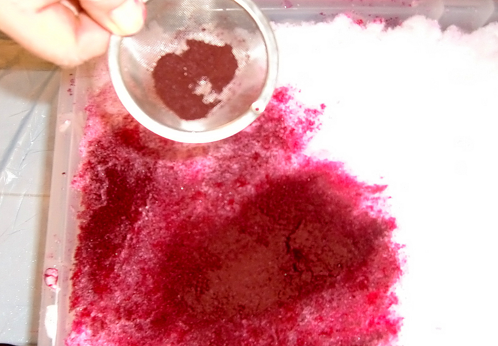 I got some snow from the back porch where the drift still made it impossible to fully open the door. We heaped snow onto the fabric, and then sprinkled dye powder over the snow. It was difficult to get it even, so we did it through a fine tea strainer.