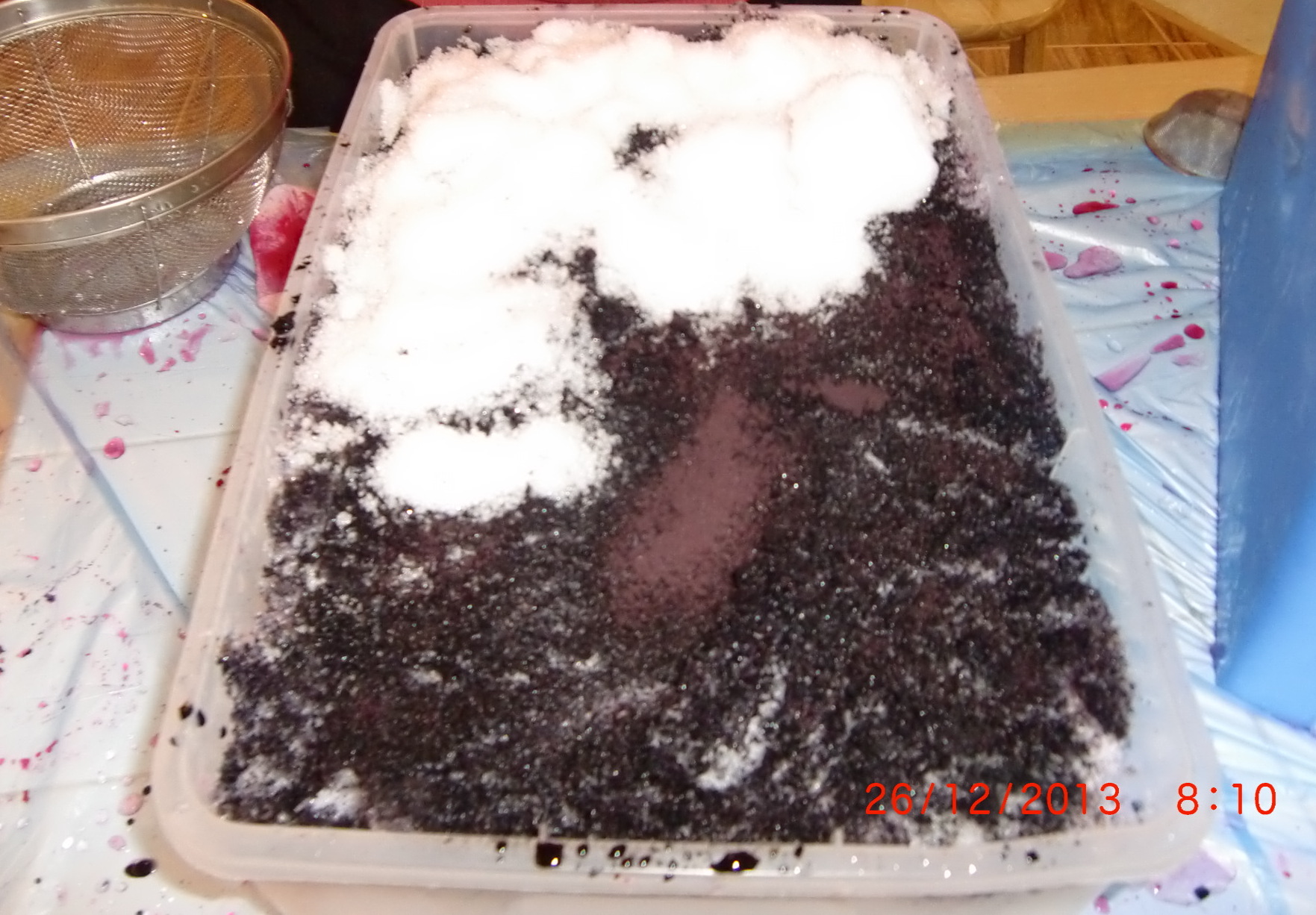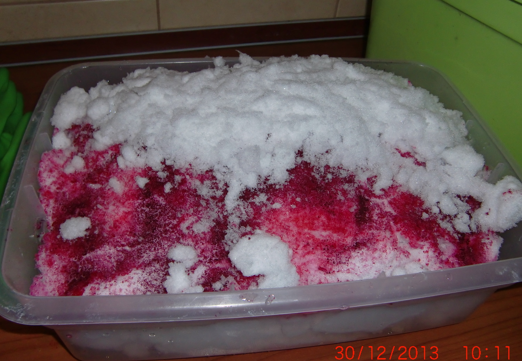 In the larger container, we did a second layer of fabric, snow and dye. Four meters of red, and two of black for this trial.