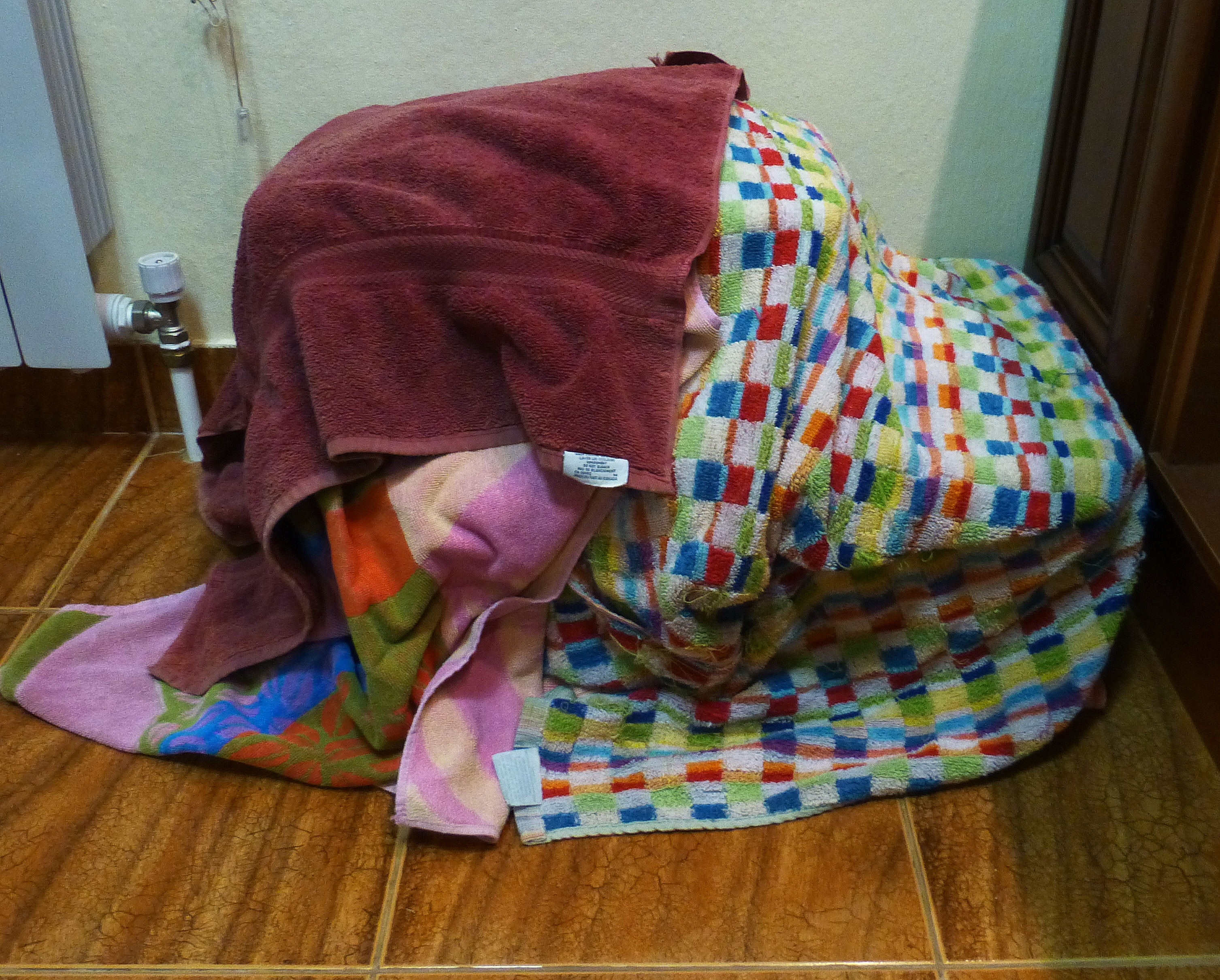 The small container that we did our two pink pieces in had a crack near the bottom, so we placed it across the mixed tub, just in case it leaked. All had a covering of plastic wrap….. and we covered the whole thing with several old towels to try to slow the melting process.