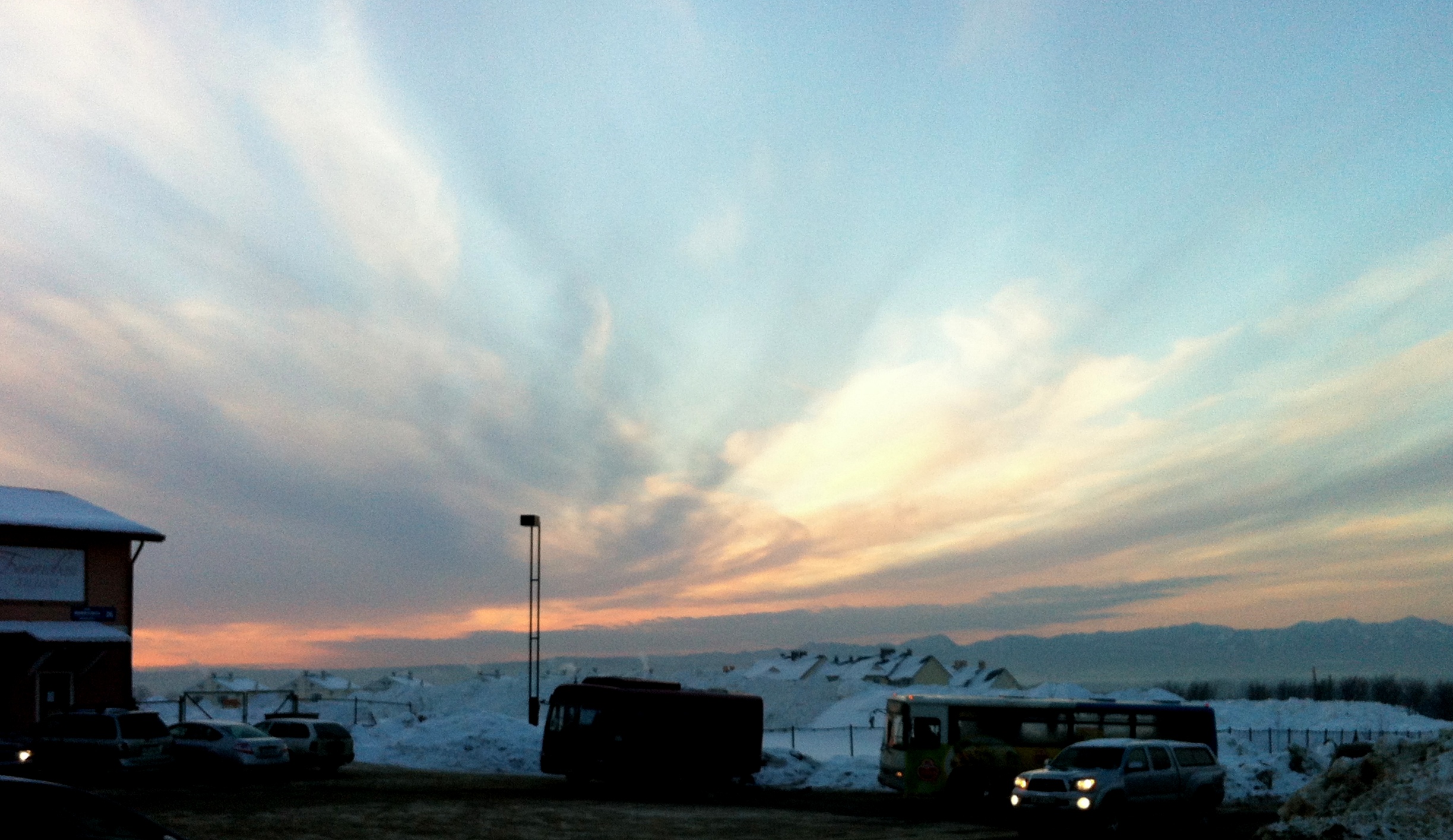 An amazing day with the kind of skies I grew up with in Saskatchewan. As we walked Snoopy this evening (5 pm) the sun was just setting.  Where it set was a brilliant red-pink, but the sky above it was unbelievable.IMG_7300