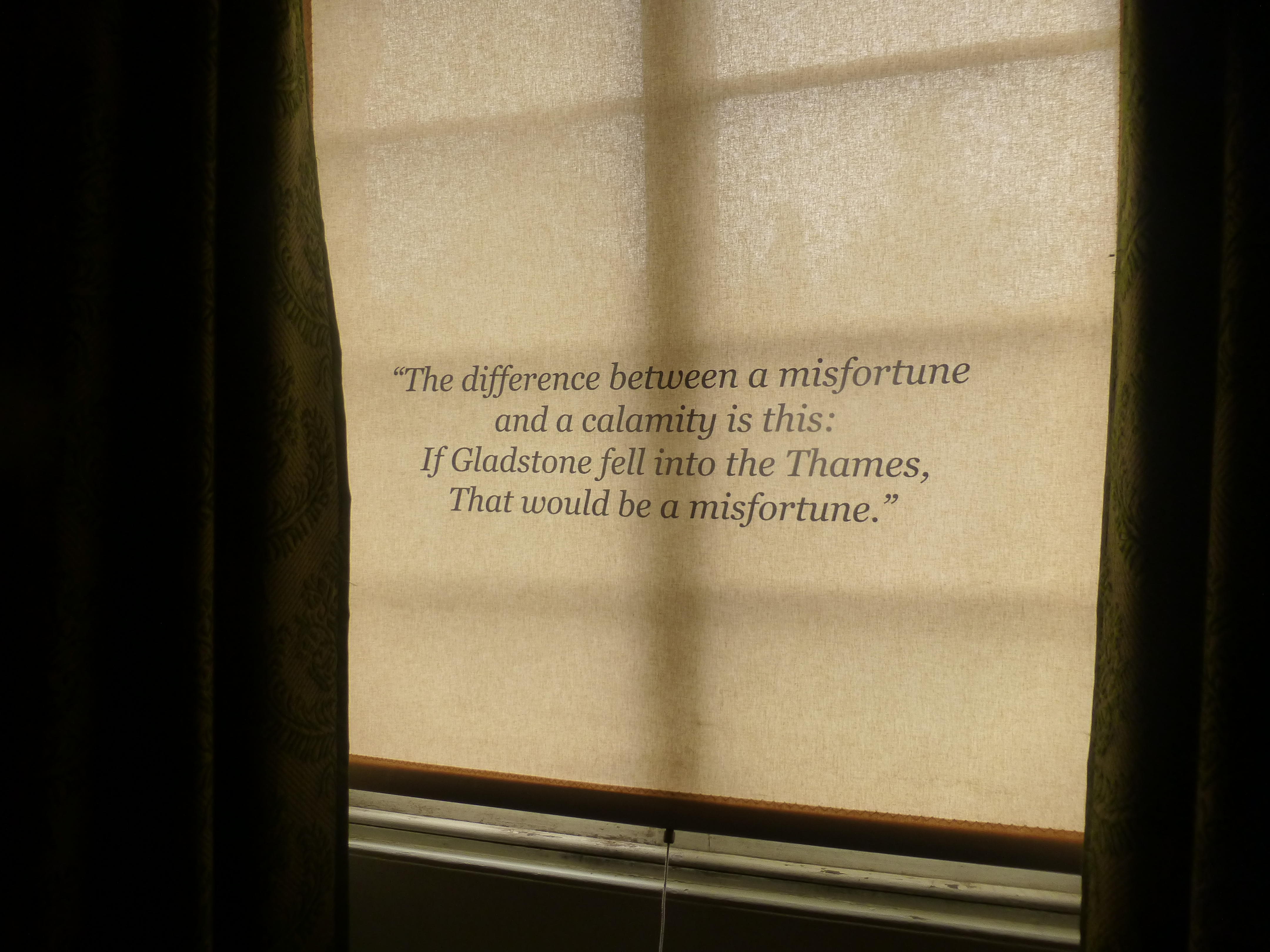 Disraeli has been dubbed “The most unlikely Victorian Prime Minister”, having risen from obscurity in London to become not only Prime Minister, but a celebrated author of novels. I will leave you with a bit of his wit – displayed on two window shades in the study…