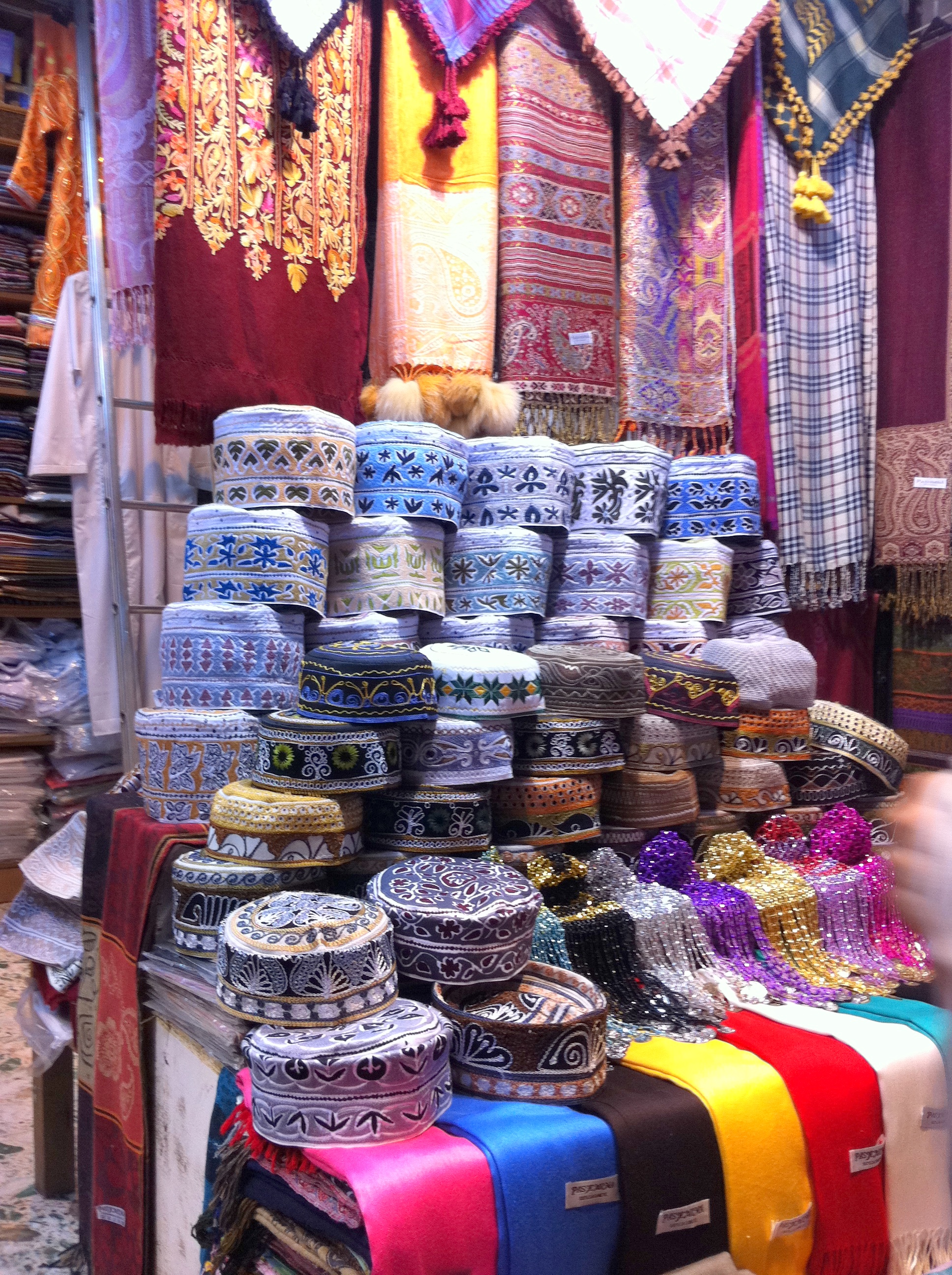 These are the traditional caps or “kumas” that the Omani men wear. The embroidery is amazing. Pashmina shawls are in the front and hanging behind. They come in every colour under the sun, in wool, silk or a combination.
