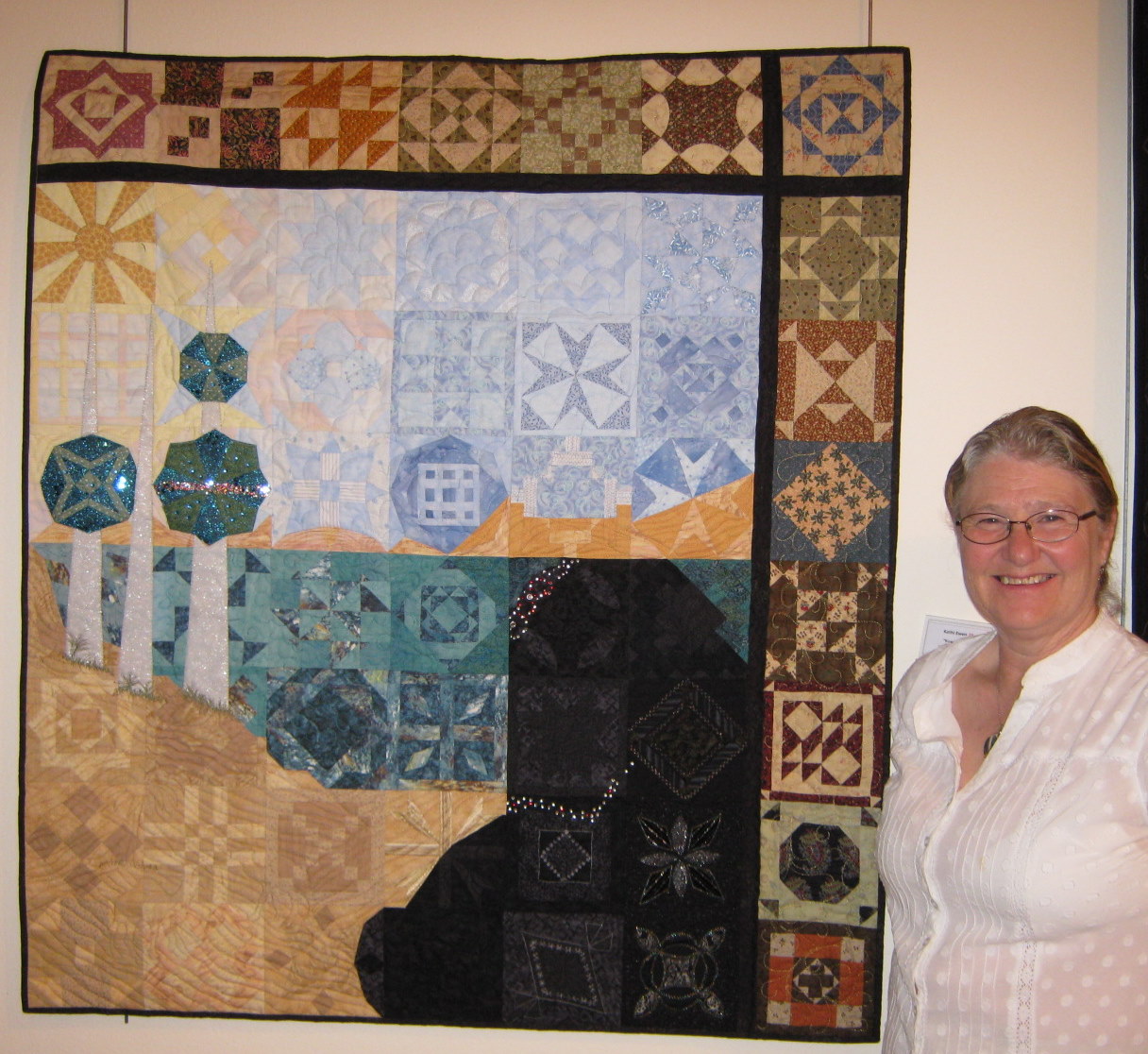 quilt, so I got out the quilt and the book, and explained how it came into being. I found a photo in the Dear Jane book called “Jane on Safari”, consisting of several DJ blocks with a lot of wonderful African animal fabrics. I liked it a lot, but wondered why the quilter didn’t use more of the DJ blocks. I wondered if I could make a scene using ONLY DJ blocks…… so I did. It was a real learning experience, picking blocks with the right lines to give me what I wanted. For those of you who don’t know about Kuwait, the black blob is a Kuwaiti lady in an abaya and hijab (scarf) looking at the Kuwait Towers, which are a landmark and symbol of Kuwait. I used applique, piecing, fancy threads and stitches on my machine, Swarovski crystals, Foundation piecing, templates…what ever would make the block the easiest.